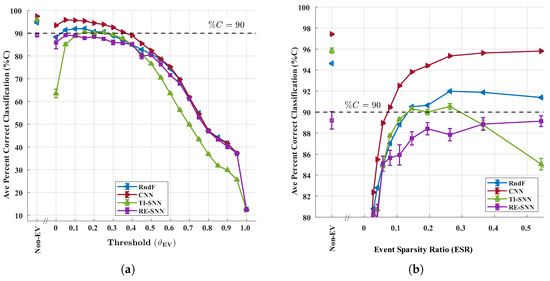 Figure 7a shows classification accuracy (%C) for the WirelessHART dataset for a selected range of eventization threshold values. The corresponding non-eventized performances for each classifier are provided and used in the subsequent non-eventized vs. eventized performance comparisons. An arbitrary %C = 90% benchmark is likewise shown for reference and used for drawing conclusions. As shown, the CNN generally outperforms all other classifiers for a majority of values, with statistically equivalent CNN and RndF performance obtained for . The RndF and TI-SNN classifiers both reach the %C = 90% benchmark and achieve near-identical eventized accuracies of at = 0.25 where performance is maximum. The RE-SNN classifier does not exceed the %C = 90% benchmark for any value, achieving a maximum eventized accuracy of at = 0.05. All classifiers show a decrease in %C at as every nonzero element of the GTX matrix is treated as an event. Since each element can only be positive or negative, the encoding collapses into a binary choice between “positive event” and “negative event.” This eliminates the third possibility of “no event,” which normally emerges once the threshold is raised above zero.