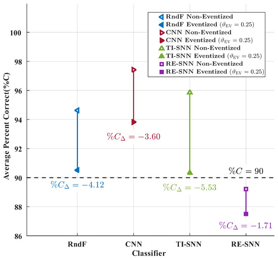 Figure 8 assesses classification accuracy of each classifier using non-eventized fingerprints (unfilled markers) and eventized fingerprints (filled markers) for = 0.25 and ESR = 0.15. The difference between the non-eventized and eventized fingerprint classification accuracies is denoted as the eventization loss, . Only the RE-SNN did not exceed the arbitrary %C = 90% benchmark. All classifiers incurred a loss in classification accuracy when transitioning from non-eventized to eventized fingerprints. However, the single-digit 5% degradation is consistent with prior eventization work and reasonably acceptable when considering energy efficiency benefits of neuromorphic-friendly eventization processing [1].