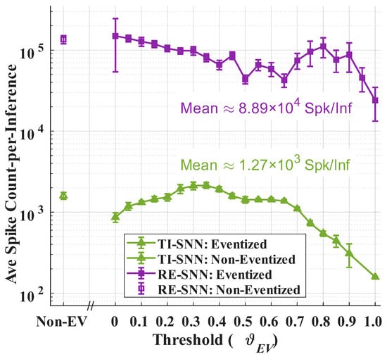Average number of spikes generated by the TI-SNN and RE-SNN classifiers as a function of eventization threshold, .