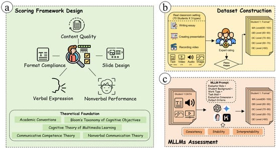Learning assessment is a core component of the educational process, directly influencing both feedback on student performance and the continuous improvement of instructional practices [15,16]. With the growing emphasis on core literacy, the focus of assessment has shifted from merely measuring knowledge acquisition to evaluating broader skill development. Assessment content has become increasingly diverse, moving beyond standardized test scores to emphasizing students’ abilities to express, create, and apply knowledge in authentic contexts [17,18,19]. As a result, non-test-based student outputs, such as project presentations, short essays, and oral reports, have become increasingly common in classroom settings. These tasks are typically multimodal in nature, involving not only Verbal Expression but also visual design and nonverbal behaviors, thus requiring evaluators to demonstrate a high level of integrative understanding and judgment. However, traditional assessment largely relies on manual grading and subjective judgments by teachers. When evaluating multimodal student work, inconsistencies often arise due to differences in individual teacher experience, leading to issues such as high subjectivity, low efficiency, and limited scalability [20,21]. In recent years, some studies have begun to explore the use of LLMs for automated scoring, but these efforts have mainly focused on structured textual tasks, such as essay grading or short-answer scoring [4,22]. For more complex, non-test-based outputs that integrate multiple modalities, the applicability and accuracy of existing models remain largely untested. Therefore, it is crucial to investigate the actual capabilities and potential value of MLLMs in the automated evaluation of such multimodal learning outcomes.