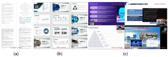The dataset consists of 210 multimodal samples (70 students × 3 types of work), including approximately 300,000 Chinese characters of academic essays, about 1050 pages of PPT presentations, and oral presentation videos totaling around 210 min. Figure 2 shows examples of the data from each modality. For privacy protection, the content in the images has been blurred. The three modalities form 70 matched sets, supporting cross-modal correlation research and analysis. In terms of the distribution of score levels, the formatting dimension had the highest proportion of A grades, exceeding 90%, indicating that most students were able to complete their work in accordance with academic paper requirements and adhere to academic norms. In the Content Quality dimension, B grades dominated, accounting for over 70%, suggesting that while students generally met basic standards in content depth and logical structure, there is still room for improvement. In the Slide Design dimension (PPT), B grades accounted for over 60%, reflecting an overall moderate performance and indicating that students possess a certain foundation in visual communication but require further enhancement. For video-based modalities, the Verbal Expression and Nonverbal Performance dimensions had B grade proportions of over 50% and 70%, respectively, a pattern that typically reflects the mild nervousness often observed in beginners during public speaking.