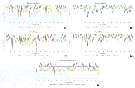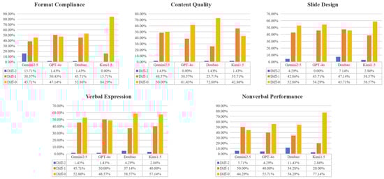 Specifically, in the Format Compliance dimension, all models generally rated lower than humans, with more dispersed distributions; Gemini showed a stricter rating tendency. For Content Quality, the models’ ratings were overall higher, mainly concentrated in A and B levels, while human ratings included some D levels, indicating that the models failed to effectively distinguish low-quality texts. In the Slide Design dimension, human ratings were primarily concentrated between A and C, with only one D rating, showing a relatively balanced distribution. In contrast, all four MLLMs gave some E ratings, representing extreme cases. Specifically, GPT’s ratings were relatively stable, focused on A and B levels, slightly higher overall than human ratings; Gemini’s ratings fluctuated widely and were generally lower; Doubao’s ratings concentrated on B and C, slightly lower than humans; Kimi’s rating trend was closer to humans, mainly distributed in A–C. For the Verbal Expression dimension, the rating distributions of the MLLMs were overall similar to those of humans. GPT’s ratings focused on A and B levels, showing a clear high-score trend; Kimi and Doubao mainly rated at the B level with concentrated distributions; Gemini’s ratings were more dispersed, covering A–C levels. In the Nonverbal Performance dimension, MLLMs’ ratings were generally lower than humans’, mainly concentrated in the B and C levels, whereas human ratings were mostly in A and B. Kimi’s ratings were the most concentrated, with the vast majority of samples rated at B; Doubao and GPT had similar rating ranges, both not covering A; Gemini’s ratings were widely distributed, spanning the A to D levels.