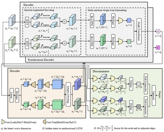 Figure 1 shows the overall architecture of GAN-SAGE, where the generator, discriminator, and synchronous encoder undergo adversarial training to continuously learn the normal network representation. The frequency feature enhanced GT-based AE serves as the generator, consists of an encoder and a decoder. When receiving attributed network time-series data G, it first splits the data into node time-series data  and edge time-series data  based on the network definition, which serve as inputs to the encoder. These inputs undergo spectral-augmentation and are then fed into a multi-attribute graph joint embedding to obtain the joint embedded latent vector z of nodes and their adjacent edges in the attributed network. The decoder is responsible for reconstructing the latent vector back into the input data structure. The discriminator takes real and generated data as inputs and outputs the discrimination results. The synchronous encoder has the same structure as the encoder, takes generated data as input and outputs its latent vector . During adversarial training, the synchronous encoder interacts with the generator to enhance the learning capability of network representations.