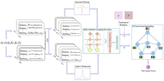 Therefore, the frequency feature enhanced GT is integrated into the AE of the adversarial training generator; the graph joint embedding method based on spectral-augmented is shown in Figure 3. The frequency feature enhanced GT takes graph time-series data of the attributed network as input. The spectral-augmentation is employed to extract rich temporal features by applying discrete wavelet transform (DWT) to the node time-series data and edge time-series data and performing targeted enhancement. The multi-attribute graph joint embedding receives the spectrally augmented time-series data. It first captures nonlinear state features within the data through multi-attribute coupling across different components. Then, it obtains global dependency information guided by edge features by incorporating the network structure, ultimately generating the latent vector of the network representation.