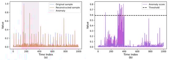 The use of GANs has gradually become a new trend in anomaly detection []. When using GANs for reconstruction-based anomaly detection, the AE serves as a generator, capturing the normal data distribution and mapping it to a latent space during adversarial training, enabling it to function as an anomaly detector by encoding normal samples into latent vectors to learn feature distributions. However, attributed networks nodes not only contain their own attribute information but are also interconnected with other nodes through diverse connection relationships. Additionally, they exhibit highly nonlinear relationships and time-dependent properties over time, making the definition of anomalies more complex and ambiguous. Traditional autoencoding methods show limitations in capturing critical contextual information and complex dependencies. In networks involving complex attributes, such as information networks and industrial control networks, where network components evolve over time with high-dimensional characteristics and multi-scale fluctuations, standard AEs often overly smooth these fine-grained network features, leading to the loss of key anomaly signals []. Therefore, it is necessary to enhance learning from normal data, improve the quality of learned representations, and enhance model robustness by identifying a wide range of complex network features [,] thereby, improving the accuracy and reliability of anomaly detection.