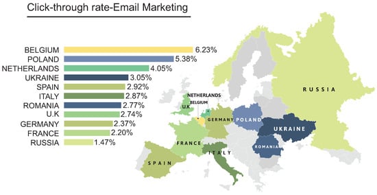 Over the past decade, rapid advancements in information technology have considerably changed the advertising and marketing industry [1]. Advertisers increasingly use various technological methods to promote their products and services more effectively and in a timely manner. This shift has resulted in the widespread use of online advertising as a crucial modern marketing communication tool [2]. Due to the increased amount of time that people of various socioeconomic levels spend on the internet, online advertising is used in e-commerce advertising and as a means of distribution. There are several key reasons why the internet has become an important advertising medium. These include the shift of television viewers to the internet, the increased time people spend on mobile devices and tablets, and the widespread availability of advanced technology and communication networks. Consequently, advertisers increasingly use social networking sites such as Facebook, Twitter, and YouTube to promote their products, as they recognize the value of online advertising as an essential tool for reaching potential customers [3]. Figure 1 shows the effect of online advertisements distributed via the internet to GetResponse customers from January to December 2023 [4], specifically through email, and the click-through rate (CTR) for these ads in various European countries.