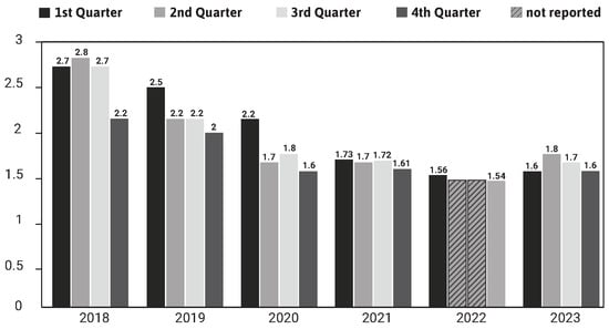 With the internet rapidly expanding and e-commerce becoming more prevalent, companies have implemented numerous methods to gather multidimensional consumer information. The rapid advancement of data analysis techniques, such as big data, machine learning, and cognitive computing, has enabled companies to categorize various customer types and profile users accurately [16]. Consequently, companies can deliver product information directly to potential customers through targeted marketing, leading to increased effectiveness and precision [17]. Various ads exist, including images, basic cards, videos, basic and optional cards, and advertiser mentions in interactive ads. Users typically are shown one or more ads and may click on an ad if a product interests them. The ad generally shows only partial information about the product, such as an image, price, and brand. Detailed information is revealed only when the customer clicks on the ad. Therefore, the CTR is a vital metric for assessing ad effectiveness. Figure 2 shows the CTR for each quarter over the past five years, which is a series compiled by Statista from underlying industry sources from the first quarter of 2018 to the second quarter of 2024 [18]. The CTR is decreasing over time, indicating that focusing on targeted customers is essential for improvement.