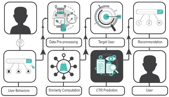 - Qin, J.; Zhang, W.; Wu, X.; Jin, J.; Fang, Y.; Yu, Y. User behavior retrieval for click-through rate prediction. In Proceedings of the 43rd International ACM SIGIR Conference on Research and Development in Information Retrieval, Virtual, 25 July 2020; pp. 2347–2356. [Google Scholar] [CrossRef]