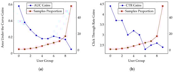 Another standard metric utilized to assess the likelihood of a randomly selected positive instance being classified as larger than a randomly chosen negative instance is the area under the ROC curve (AUC). A higher AUC is directly correlated with superior CTR prediction performance. This metric serves as a strong indicator of the predictive model’s accuracy and effectiveness. Importantly, as the user base increases, an increase in the AUC of 0.001 is significant for the CTR prediction task when deployed in industries [37].