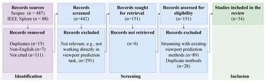 We used the Scopus and IEEE Xplore databases as these cover the majority of high-impact computer science and multimedia venues relevant to viewport prediction. We used the following search keywords: “viewport prediction” AND (“360 video” OR “360° video” OR “360-degree video” OR “omnidirectional video”). Boolean operators AND/OR were applied consistently across both databases. Paper selection was performed independently by at least two reviewers, with disagreements resolved through discussion to reduce bias. We provide the PRISMA flow diagram in Figure 2.