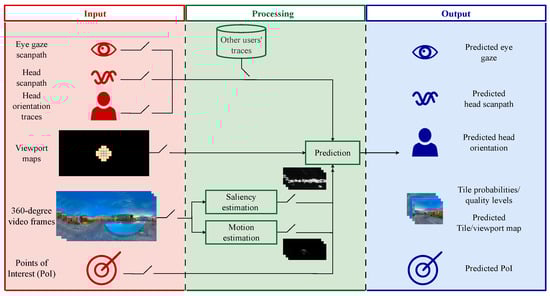 Finally, the outputs depend on both the input type and the processing method. Possible outputs include the predicted eye gaze, head scanpaths, or orientations. Additionally, algorithms could provide as output, for each frame tile, either its probability of being part of the viewport or its assigned quality level. In other cases, viewport prediction methods could directly output the future PoIs or a set of predicted tiles or viewports.