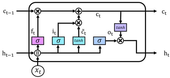 Long Short-Term Memory (LSTM) [19]: It is one of the most famous RNN algorithms, which addresses the vanishing gradient problem in RNN. LSTM solves this problem by utilizing the cell state for long-term dependencies and employing input, forget, and output gates to regulate information update, retention, and discard, respectively. The overall LSTM cell architecture is shown in Figure 1. The definition of forget gate , input gate , and output gate at t are given as