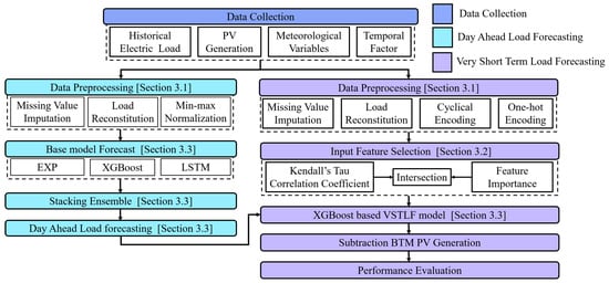 Figure 2 shows the overall flow of the proposed framework. At first, we gather all the relevant data to forecast electric load and preprocess the gathered data (Section 3.1). The proposed XGBoost-based VSTLF model selects proper input features using Kendall’s tau correlation and FI analysis (Section 3.2). The selected features and DALF result are used as the final input features to the VSTLF model (Section 3.3).
