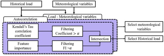 Because various external factors influence electric load, input features commonly used in load forecasting models include meteorological variables and historical load. A negative impact on forecasting accuracy may result from including some features with low electric load correlation. Therefore, selecting features is essential to improve forecasting performance. To this end, we analyze the nonlinear relationships between electric load and potential features using Kendall’s tau correlation coefficient and the FI score. Additionally, the temporal dependency of electric load is assessed through autocorrelation analysis, which complements the insights obtained from Kendall’s tau and FI. Based on this analysis, features with low correlation to electric load are excluded from the input feature. The process of selecting input variables is shown in Figure 4. We introduce a threshold value to filter the low correlation features for Kendall’s tau correlation coefficient and the FI score. The final input features are obtained by the intersection of the two outputs. The intersection is required to ensure the selected feature possesses a meaningful correlation with both metrics.