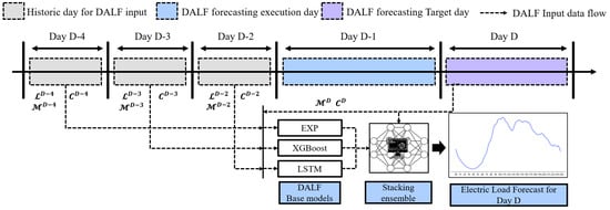 Figure 5 shows the DALF procedure. Here, , , and represent the electric load, meteorological, and calendar variables, respectively. The three DALF base models use , , and from the past three days as input features, in addition to the and of Day D. The final forecast is generated through a stacking ensemble that combines the base models’ outputs with the target day’s information.