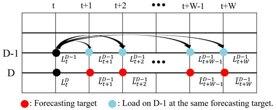 where represents the load observed at t on D − 1. To account for time-specific load variability, the proposed model calculates 15-minute load variations over a forecasting window of size W, drawing data from each corresponding historical time point. Figure 6 shows the meaning of load variation. The load variation is calculated using the previous day (D − 1) before the VSTLF forecasting execution day, corresponding to the same forecasting time horizon.