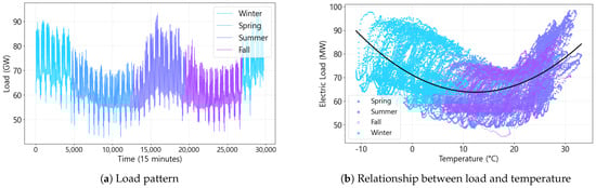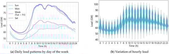 Figure 8 and Figure 9 show the characteristics of the load in 2022, including seasonal, weekly, and hourly variations. As depicted in Figure 8a, the seasonal load pattern is a direct consequence of heating and cooling needs that vary with temperature. Loads in summer and winter are typically higher than those in spring and fall due to heating and cooling electricity demands. On the other hand, in spring and fall, loads remain relatively consistent despite temperature fluctuations as heating and cooling demand is inactive during these seasons. The analysis of the load–temperature relationship in Figure 8b clearly indicates that load sensitivity to temperature is lower during spring and autumn than during summer and winter. Figure 9a shows daily load patterns in a week. Due to the significant impact of industrial loads in Korea, weekday loads are generally higher than weekend loads. For the same reason, weekend loads are lower and show different patterns compared to weekdays. Monday early morning loads are typically lower than other weekdays due to the residual effect of reduced Sunday loads. Based on these observations, the days of the week are categorized into four groups—Monday, weekdays (Tuesday through Friday), Saturday, and Sunday; thus, we set the number of DoW clusters R to four. The categorization of days into four groups is a typical approach in the Korean power system [27,30,32]. Figure 9b shows the hourly distribution of load. During working hours (8 h–18 h), the load is typically larger and more volatile, increasing forecasting uncertainty.