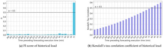 The results of the correlation analysis are shown in Figure 10 and Figure 11. Figure 10a and Figure 10b, respectively, present the FI score and Kendall’s tau correlation coefficient between the historical load during the six hours preceding the forecasting time and the target load over the subsequent six hours. Both the FI score and Kendall’s tau correlation coefficient consistently show the load 15 min before the forecasting execution time to have the strongest correlation with the upcoming six-hour load, i.e., FI score = 0.71 and Kendall’s tau correlation coefficient = 0.59. Unlike the FI score, the Kendall’s tau correlation coefficient exhibits a gradual decline with increasing time lag from the forecasting execution point.