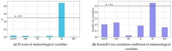 Figure 11a,b show the correlation between meteorological variables and electric load. In both analyses, temperature is consistently identified as the meteorological variable with the strongest correlation to the reconstituted load, with an FI score of 0.88 and a Kendall’s tau correlation coefficient of 0.54. Solar irradiance, however, shows a weak correlation with the reconstituted load. These results indicate that the effect of BTM PV generation has been effectively mitigated in the reconstituted load.
