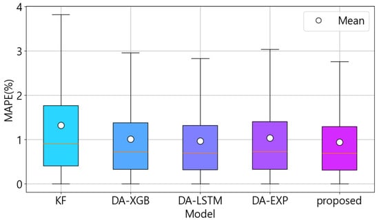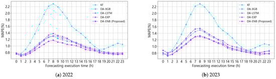 Figure 14 shows the average 6-hour MAPE across different forecasting execution times of each model. VSTLF models using DALF results, including the proposed model, achieve notable improvements over the KF-based model, particularly during daytime hours when load variability is higher. These daytime hours are characterized by greater volatility in electric load due to industrial activity and BTM PV generation. The use of DALF results enables VSTLF models to capture these fluctuations efficiently.