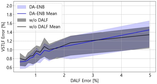 Figure 13 shows the relationship between DALF error of ENB (x-axis) and VSTLF errors of DA-ENB and “w/o DALF” (y-axis). The solid line and shaded area represent the mean and the 25–75% quantile band, respectively. The results exhibit a clear upward trend, indicating that larger DALF errors are associated with larger VSTLF errors. This observation further supports the conclusion that providing more accurate trend information from DALF contributes to better accuracy and robustness in VSTLF.