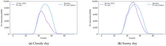 Table 6 shows the MAPE of VSTLF on days with abrupt PV generation changes in cloudy and sunny days. Figure 15 illustrates the PV generation patterns on these days. In both cases, an abrupt decrease in PV generation is observed during the afternoon period. Even these conditions, the proposed model shows the best forecasting accuracy compared with the benchmark models.