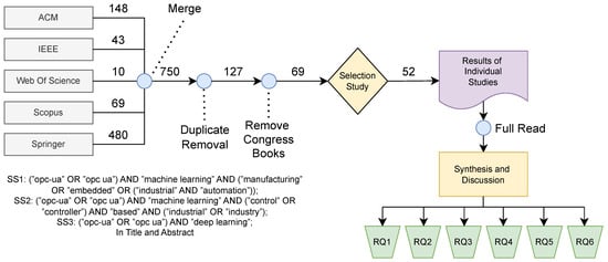 Before detailing the proposed systematic review methodology, a review of the state-of-the-art surveys is conducted. Schindler et al. [] conducted a mini-review showing that reinforcement learning applications with OPC-UA highlight the protocol’s potential for enabling adaptive control systems that can learn and optimize industrial processes in real-time. This work reveals that OPC-UA’s publish-subscribe mechanisms and historical data access capabilities provide the necessary infrastructure for reinforcement learning agents to observe system states, execute actions, and receive feedback from industrial processes. This work focuses specifically on the reinforcement learning area. Furthermore, the systematic literature review proposed by Velesaca et al. [] shows that the integration of data mining and natural language processing with OPC-UA demonstrates how the protocol’s semantic information models can be leveraged to extract meaningful insights from industrial data streams. This enables more sophisticated Machine Learning applications such as anomaly detection, pattern recognition, and automated decision-making. Similar to the previous work, it only focuses on specific techniques for data mining and NLP. Finally, Balador et al. [] present a literature review showing that OPC-UA serves as a communication middleware. This allows for the seamless data exchange between diverse industrial systems and provides the standardized interface necessary for Machine Learning algorithms to access real-time operational data. The previously reviewed works show how OPC-UA can be integrated with Machine Learning models, which will be carried out. However, these works do not show implementation details, specific architectures, or a complete detail of all existing technique categories.