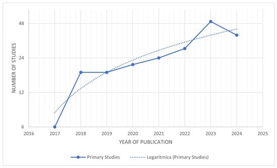 The result is a set of articles to read and answer the research questions and, based on the results, write this research. Figure 2 shows the temporal evolution of primary studies from 2017 to 2024, with a logarithmic trend line. Starting with 6 studies in 2017, a significant increase is observed up to 18 studies in 2018, followed by a period of more gradual growth. The number of studies peaks in 2023 with 48 publications, then declines to approximately 40 studies in 2024. The logarithmic trend line suggests that, although the field has experienced sustained growth, the growth rate is leveling off over time.