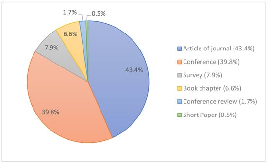 On the other hand, Figure 3 shows the distribution of different types of academic publications. Articles of journals account for the largest proportion with 43.4% of the total, closely followed by conferences with 39.8%. Surveys account for a smaller proportion with 7.9% and book chapters at 6.6%. The smallest categories are conference reviews with 1.7% and short papers with just 0.5% of the total. This distribution suggests that most publications in this field are done mainly through scientific journals and conferences.