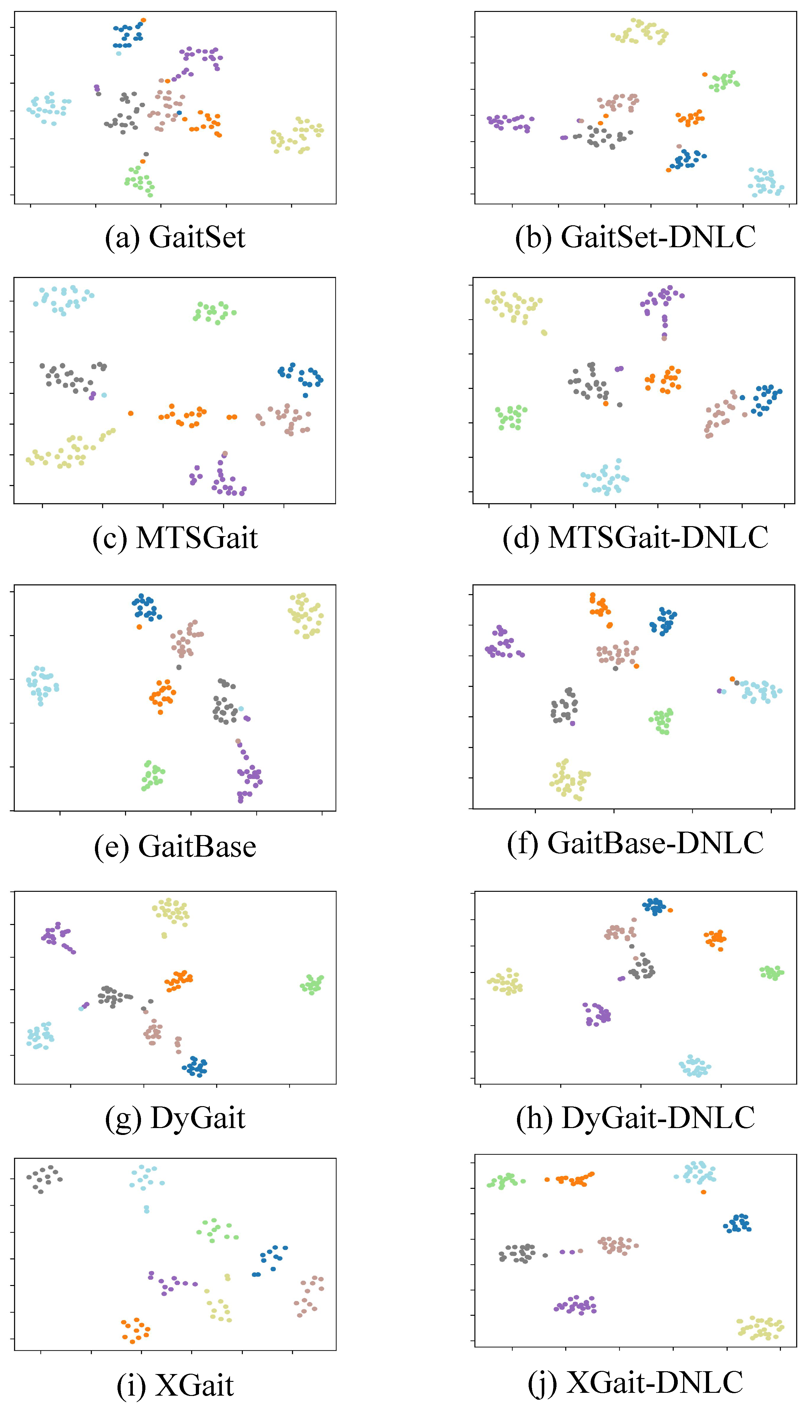 - Extensive experiments demonstrate that our proposed method can effectively promote the performance of existing gait recognition methods. As a plug-and-play solution, the DNLC framework can be seamlessly integrated into existing gait recognition systems without the need for additional complex operations or techniques.
