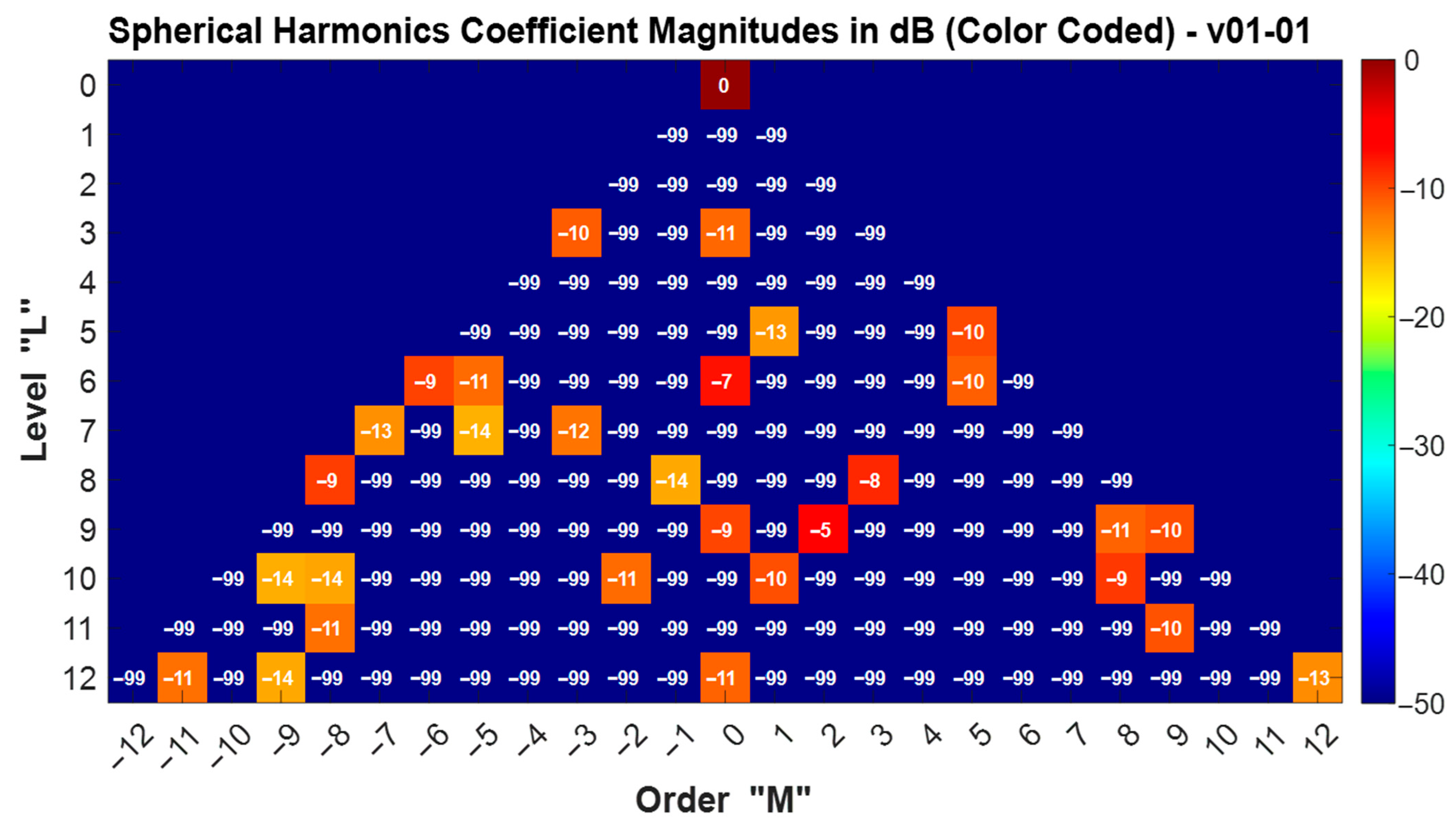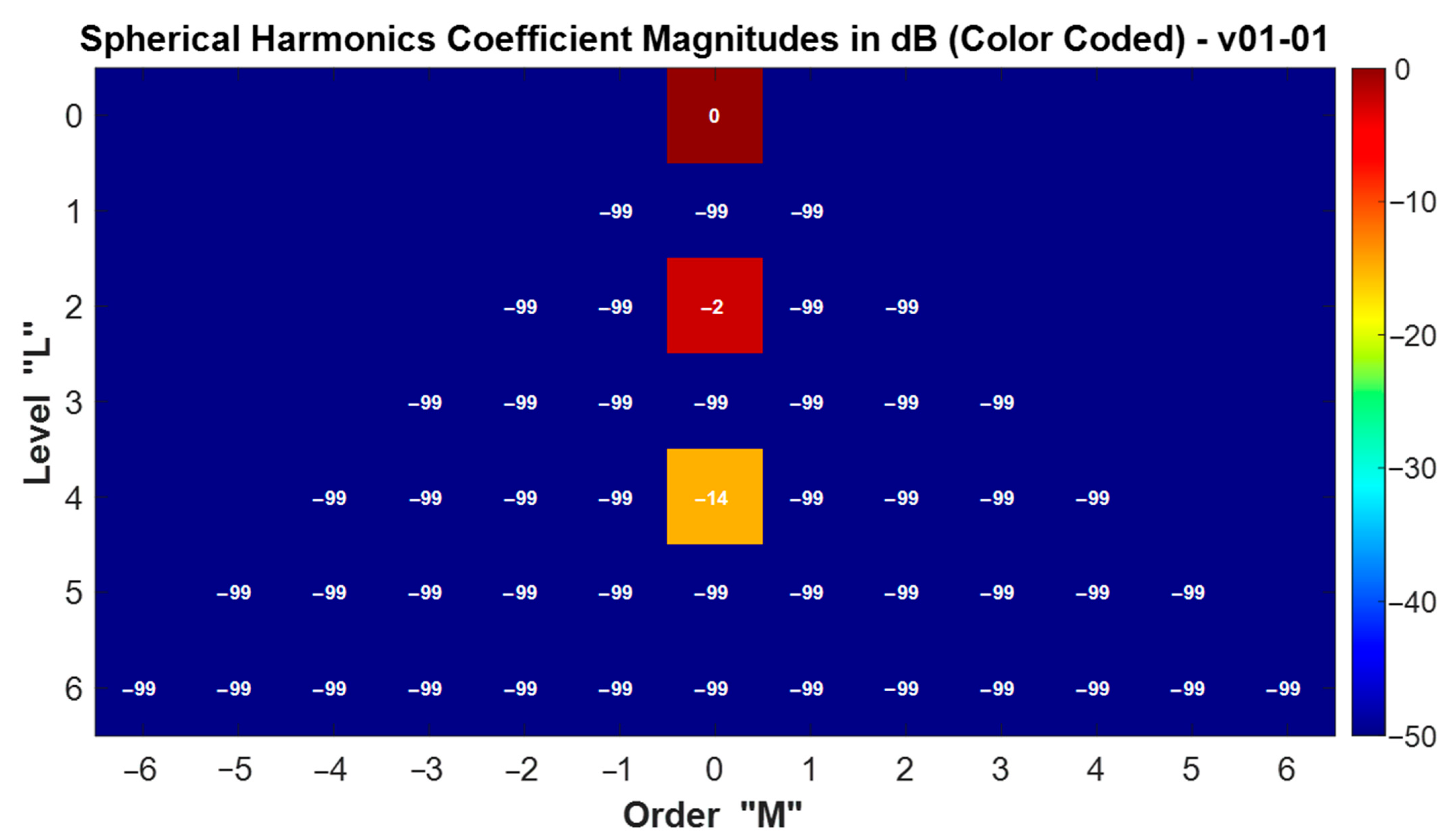 Tolerance was discretionally set to . As before, further research is required to determine the optimal value of this parameter depending on the specific characteristics of each application scenario. Solving the system yields a solution vector containing the SH coefficients.