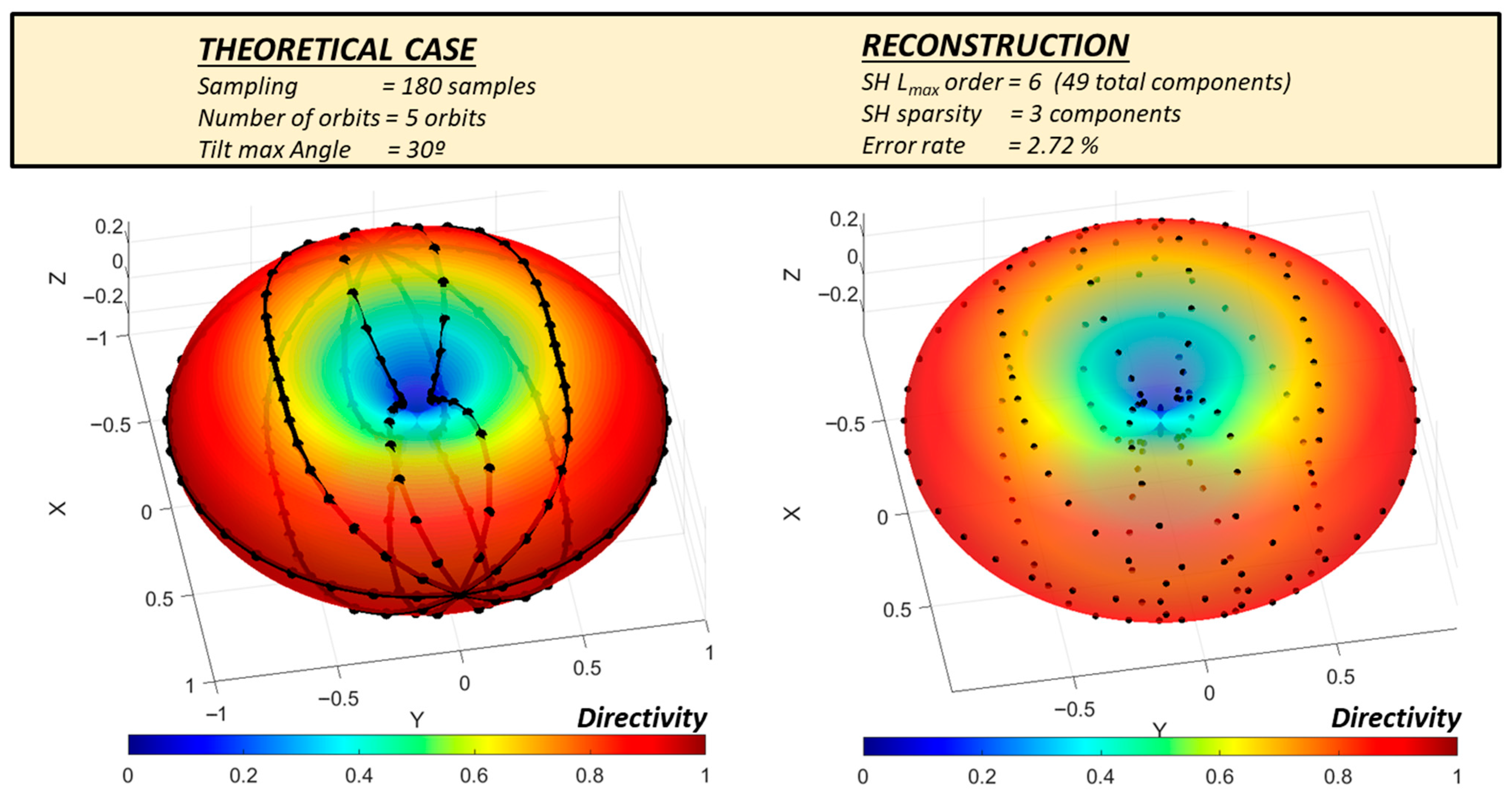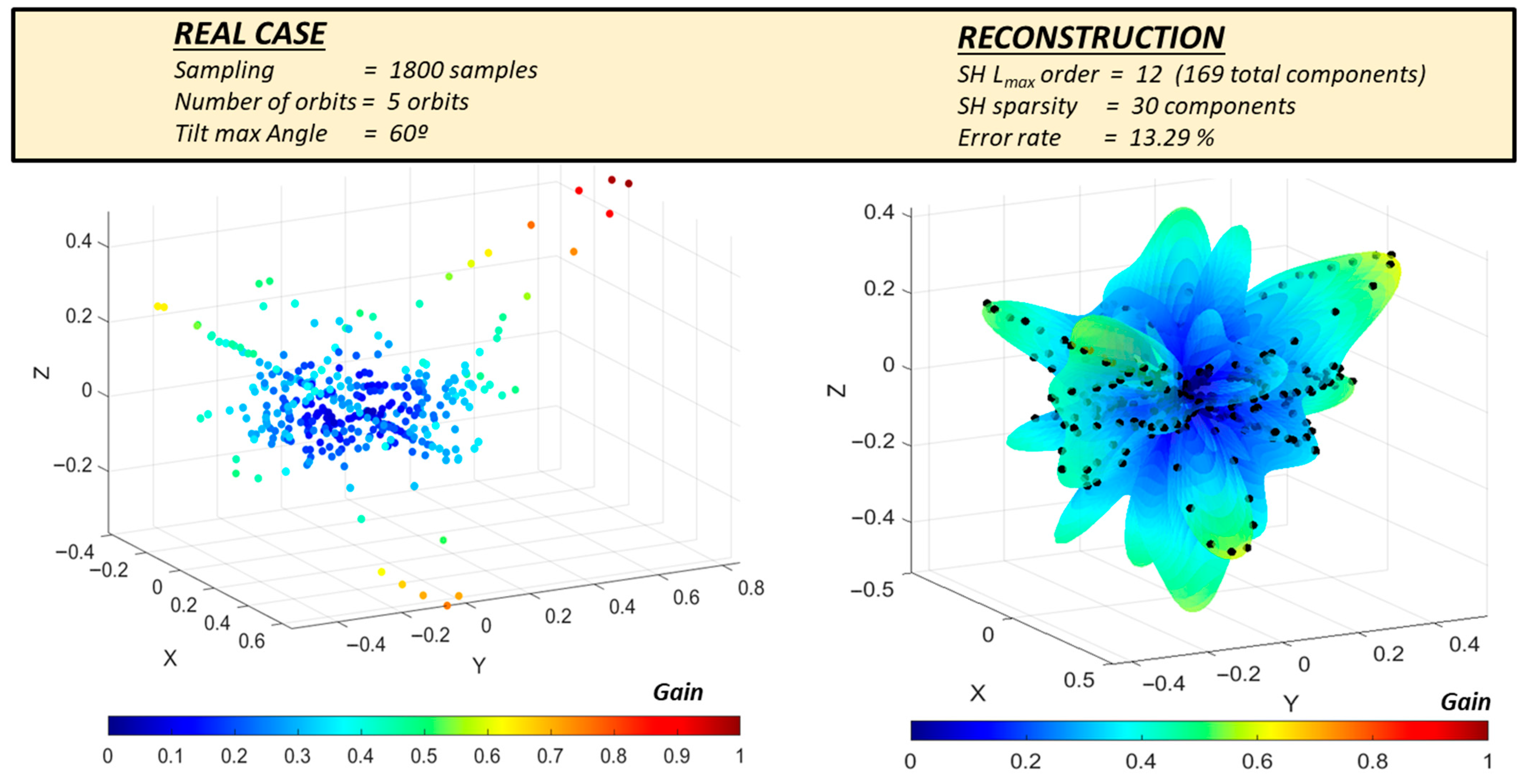 Figure 10). This observed error level warrants further discussion regarding its practical acceptability and relation to typical measurement uncertainties. In the practical case, the reconstruction error reached an average value of 14%. Although this figure may appear relatively high, it remains acceptable within an application-driven characterization framework. First, it is of the same order of magnitude as typical measurement uncertainties in anechoic chambers (≈5–10%), which depend on probe calibration, system stability, and noise levels. Second, most of this error is concentrated in angular sectors that are mechanically inaccessible, with negligible contribution to the device’s effective wireless coverage. In the operationally relevant directions, the error remains well below the global average. Finally, for bulky and non-rotatable devices, the primary objective is not to achieve a full-sphere reconstruction but to provide reliable information in the regions of interest, enabling seamless integration of the SH-based representation into propagation simulators and electromagnetic optimization workflows. The results demonstrate that the original function can be recovered with sufficient accuracy using only 1800 samples distributed over five orbits with a maximum WT angle of 60°.