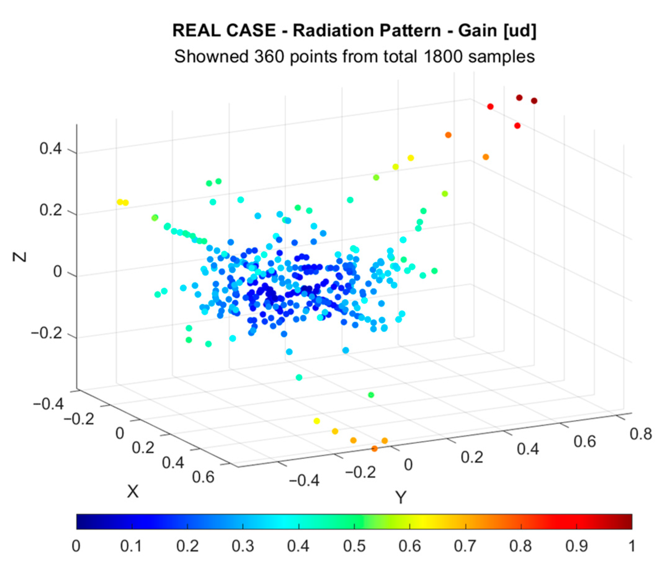Figure 8 shows a representative subset of cloud points corresponding to the recorded measurements. Due to the nature of this acquisition strategy, the resulting sampling of the complete radiation pattern is inherently sparse and limited, with most of the measurements concentrated at very low elevation angles