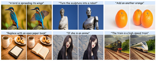 - Brooks, T.; Holynski, A.; Efros, A.A. InstructPix2Pix: Learning to Follow Image Editing Instructions. arXiv 2022, arXiv:2211.09800. [Google Scholar]