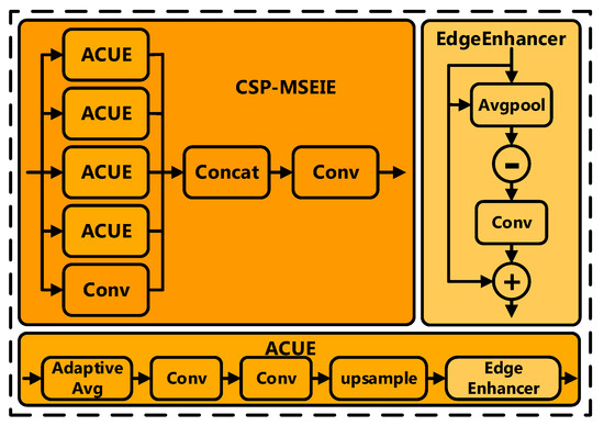 The C2f module within the YOLOv8n network is limited to a single scale, rendering its local convolution operations ineffective for feature extraction in complex images that contain multi-scale targets. This limitation consequently contributes to diminished detection accuracy for multi-scale defects. To overcome this limitation, we redesign the C2f module by integrating Multi-Scale Edge Information Enhancement (MSEIE) module, which concurrently extracting information from various scales while explicitly enhancing edge information. Furthermore, the module is optimized using the Cross Stage Partial (CSP) structure from CSPNet [22], resulting in the CSP_MSEIE module. This optimized module has a lower parameter count and computational load. The structure of the CSP_MSEIE module is illustrated in Figure 2.