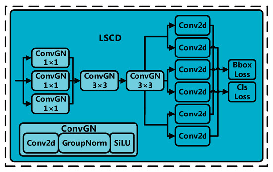 As shown in Figure 4, the LSCD utilizes a shared convolutional layer architecture to improve feature reuse efficiency. This approach applies a unified convolutional kernel to multi-level input features, thereby establishing a parameter-sharing mechanism that eliminates the redundancy inherent in independent convolutional layers and markedly reduces model complexity. Furthermore, LSCD replaces standard convolutions with Conv_GN, which employs GroupNorm [23] to partition channels into multiple groups and normalize each group using a separate mean and variance. This strategy is critical for mitigating the performance degradation often observed with BatchNorm during small-batch training, a common scenario for resource-constrained platforms, thus enhancing overall model stability and accuracy.