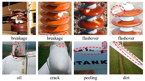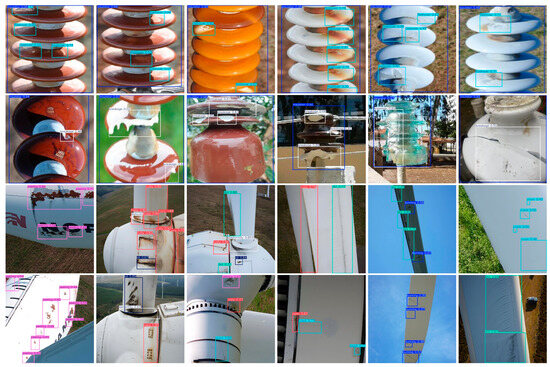 To facilitate robust training and evaluation, two custom-built datasets were constructed for this study, focusing on insulator and wind turbine blade defects, respectively. The first dataset, dedicated to insulator inspection, comprises 1195 images and encompasses three distinct classes: ‘insulator’, ‘flashover’, and ‘breakage’. The second, focusing on wind turbine blade inspection, consists of 4467 images categorized into seven classes: ‘burning’, ‘crack’, ‘deformity’, ‘dirt’, ‘oil’, ‘peeling’, and ‘rusty’. All images across both datasets were meticulously annotated using LabelImg 1.8.6. Following annotation, the entire collection was partitioned into training and validation sets according to a 7:3 ratio. Representative samples from each dataset are illustrated in Figure 5.