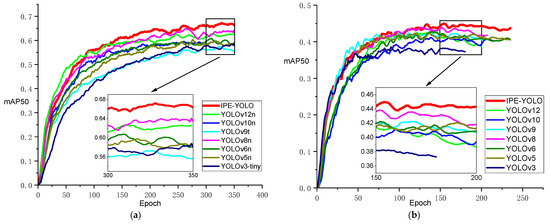 To verify the stability and reproducibility of the observed improvements in detection accuracy, two sets of repeated experiments were conducted. As summarized in Table 1 and Table 2, the proposed method achieved accuracy gains of 2.6% and 2.9% on the two respective datasets, confirming the robustness of the performance enhancements. Furthermore, the model underwent multiple experiments on both datasets, with the resulting mAP curves shown in Figure 7. The curves in the figures have been smoothed using the adjacent averaging method. When calculating each smoothed point, the average of that point and a total of five points before and after it will be taken. This smoothing eliminates large random fluctuations in the training curves, thereby revealing clearer performance trends. The curves indicate that the mAP of the IPE-YOLO model surpasses that of other mainstream YOLO models of a comparable scale, such as YOLOv12n and YOLOv10n. This result confirms that the adopted improvements have enhanced the model’s detection accuracy, enabling more precise and comprehensive recognition of defect targets.