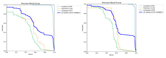 A comparative analysis of the precision–recall (P-R) curves for the proposed IPE-YOLO and the baseline YOLOv8n model is presented in Figure 8 and Figure 9 for the insulator and wind turbine blade datasets, respectively. The plots illustrate the P-R curves for each class at an mAP0.5 threshold. A superior P-R curve is characterized by its proximity to the top-right corner, as the enclosed area under the curve directly corresponds to the average precision. On the insulator dataset, the most substantial improvement is observed for the ‘breakage’ class. This class is characterized by considerable scale variation, with some instances subtending a minimal pixel area. The proposed improvements effectively enhance the model’s ability to detect such multi-scale defects, increasing its accuracy by 6.1%. Additionally, the curve for the flashover class becomes steeper, indicating that the model maintains high precision for flashover defects even at high recall rates, with detection accuracy improving by 4.2%. Similarly, on the wind turbine blade dataset, the performance gain for the ‘burning’ class is the most pronounced. Given that ‘burning’ defects are typically small-scale objects, the 4.8 percentage point AP increase validates the model’s effectiveness in mitigating the common challenge of small object detection. Concurrently, for the peeling defect, which also has large scale variations, the model’s optimization resulted in an increased area under the curve, improving its detection accuracy by 2.8%.