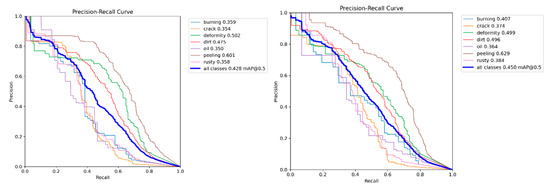 Overall, the comparative P-R curve analysis confirms that the proposed model substantially improves the model’s multi-scale defect detection capability. This improvement is especially evident in classes involving small or scale-variable targets, which traditionally pose challenges for general-purpose object detectors.