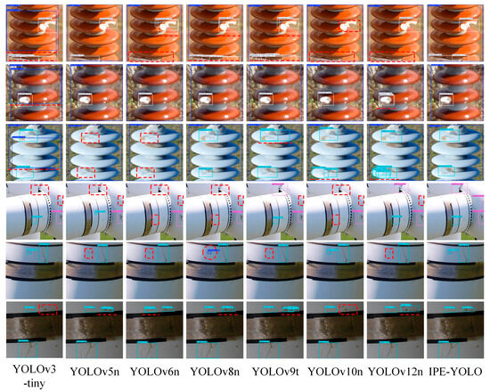 On the insulator dataset, the IPE-YOLO model achieved the best detection accuracy of 67.2%. In comparison with YOLOv3-tiny, a representative of early lightweight object detection models, the proposed IPE-YOLO model reduced the number of parameters and computational cost by 78.3% and 66.4%, respectively, while achieving a 3% improvement in detection accuracy. Compared to YOLOv5n, an algorithm widely applied in real-time detection scenarios, IPE-YOLO significantly improved detection accuracy by 6.1% with a 14% reduction in computational cost. The improvements were also evident when compared with YOLOv6n and YOLOv9t, with IPE-YOLO achieving 10.1% and 5.4% higher accuracy, respectively. In contrast to the state-of-the-art YOLOv12n, IPE-YOLO demonstrated a superior balance between lightweight design and accuracy, achieving a 20.8% accuracy improvement with a similar number of parameters and computational cost. Finally, compared with the baseline model, YOLOv8n, IPE-YOLO improved accuracy by 2.8% while reducing the number of parameters and computational cost by 12.3% and 24.7%, respectively. These results confirm that IPE-YOLO delivers notable improvements in multi-scale defect detection while further optimizing model efficiency.