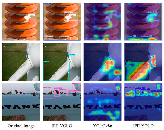 To provide insight into the models’ feature localization capabilities and attention distribution, we employed Gradient-weighted Class Activation Mapping (Grad-CAM) [32] to generate heatmap visualizations, as presented in Figure 11. The trained IPE-YOLO model was used to detect defects in images from both datasets, demonstrating its ability to accurately locate the targets. In these visualizations, a more effective result is indicated by red areas that are highly concentrated on the target’s center and interior. The comparative results in the figure show that the YOLOv8n model struggles to capture the target region and its attention is dispersed. In contrast, the attention of the improved IPE-YOLO model is consistently focused within the boundaries of the detected targets. Compared with YOLOv8n, IPE-YOLO exhibits a higher degree of focus on the defect regions, which indicates that it possesses a stronger ability to extract and integrate defect-relevant features while effectively suppressing interference from irrelevant background information. Such targeted attention distribution directly contributes to the improved detection accuracy observed in both insulator and wind turbine blade defect inspections, reinforcing the conclusion that the proposed enhancements lead to superior feature representation and localization robustness.