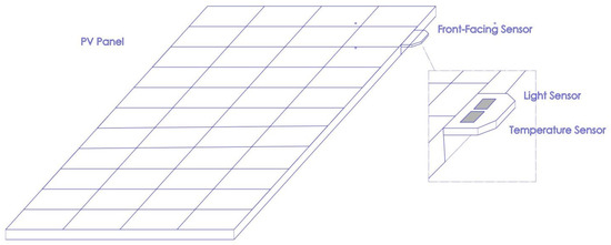 This project is dedicated to the design and fabrication of a device capable of monitoring various data points useful for understanding and operating a photovoltaic (PV) system. Currently, maintenance of PV arrays is limited, and the only common method for assessing performance is by monitoring power output [14]. However, this metric alone is an unreliable indicator of overall PV health due to unrelated factors such as cloud coverage or fluctuating weather conditions [15]. To address this issue, we aim to provide an economical system that utilizes sensors to measure key parameters, including light intensity, voltage, current, and temperature, and display this information via an LCD interface. Such a system can detect inefficiencies—such as dust accumulation on the PV surface—that contribute to reduced power output. When the system identifies an issue, the user is notified through the LCD interface and can take corrective action. This approach promotes optimal and consistent PV array performance, potentially extending the system’s lifespan. The complete package consists of a sensor-equipped device mounted on the PV module, as shown in Figure 1 and Figure 2, and an LCD display positioned for user interaction. Figure 1 shows a sketch of the position of mounting the temperature and the light sensor on the photovoltaic panel. Figure 2a shows the components that are mounted on the back of the panel. A box that contains a power supply and a charge controller is mounted on the back of the panel, and it connects to the sensors. It features an LDR sensor, a voltage divider principle, a current sensor, and a temperature sensor. The measured data is displayed by a microcontroller on an LCD screen, as shown in Figure 2b. The power supply for the system is provided by a conventional AC supply. To accomplish compatibility with our system, the voltage will be stepped down to 12 V with a transformer, then converted from AC to DC current with a rectifier before being passed through a 5 V regulator.