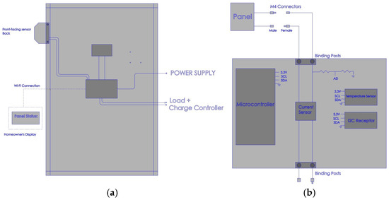 (a) The power supply, load and charge controller are all contained in a box that is mounted on the back of the panel. (b) The current sensor, microcontroller and I2C receptors, which connect to the panel and are mounted on the back.