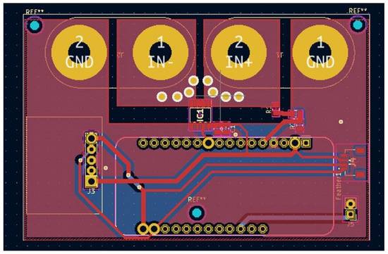 The layout of the circuitry with the board connected to the terminals of the PV panel.