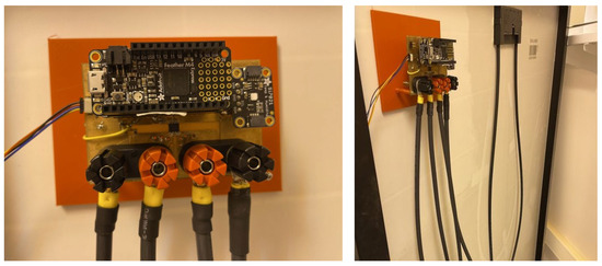 We sized and designed all components of this project to operate with the Evergreen Solar ES-A-200 model solar panel, which has a maximum voltage of 22 V and a maximum current of 12 A. Voltage and Current meters may need to be adjusted if using panels of different specifications; however, current meters capable of such demands are available, and the voltage divider can be adjusted. We have elected to use the Feather M4 Express paired with the Airlift Featherwing as our microcontroller. Two of these feathers are used, one on the panel collecting data, and the other receiving data and displaying it on the LCD screen. We used the following sensors: (1) Current Meter: TMCS1108A3U-Q1; (2) Voltmeter: Voltage Divider (R1 = 52 kΩ; R2 = 8.2 kΩ); (3) Temp & Humidity Sensor: Si7021; and (4) Light Sensor: BH1750. The control box is the main component of the system’s hardware and represents where all information is collected and pushed to the cloud. This piece of hardware is given a central location in the system.