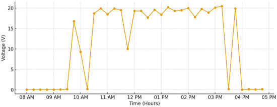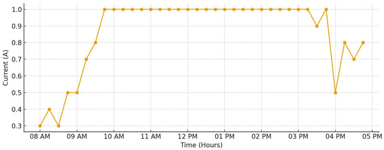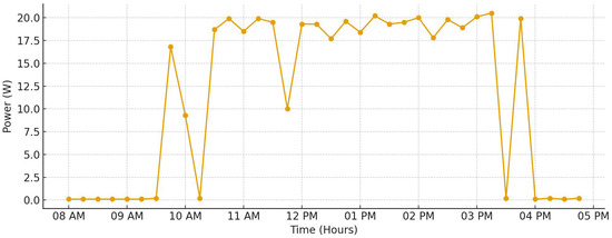 Figure 7 presents detailed measurements of the system’s voltage readings recorded continuously from 8 a.m. through 5 p.m. At the start of the day, the voltage measurement begins at 0 V, indicating no power generation during the early morning hours before sufficient sunlight is available. As the morning progresses, around 9:30 a.m., the voltage output begins to rise sharply, reaching approximately 16 V. This increase corresponds to the rising intensity of sunlight as the sun climbs higher in the sky. Following this initial increase, the voltage stabilizes and maintains a fairly consistent level around 20 V for the remainder of the daylight period until approximately 4 p.m., when solar intensity starts to decline. After 4 p.m., as the sunlight diminishes further, the voltage output steadily decreases, eventually returning to 0 V, signaling the end of power generation for the day. Similarly, the current measurements, as displayed in Figure 8, follow a corresponding pattern. Initially, the current begins at a baseline value of approximately 0.3 A in the early morning when minimal light is present. As the available solar energy increases, the current output rises to about 1 A, where it remains relatively stable and consistent throughout the prime daylight hours. This steady current continues until approximately 4 p.m., after which it gradually declines to around 0.8 A as the sun begins to set and light intensity decreases. In Figure 9, the output power of the system is also illustrated, showing that power generation commences around 9:30 a.m., aligning with the earlier increases observed in voltage and current. The power output stabilizes at an approximate value of 20 W during peak sunlight hours and maintains this level consistently until approximately 4 p.m. before declining as solar input decreases.