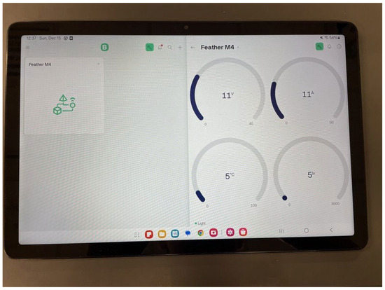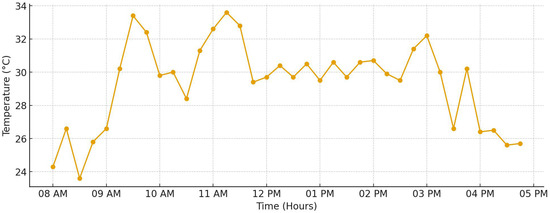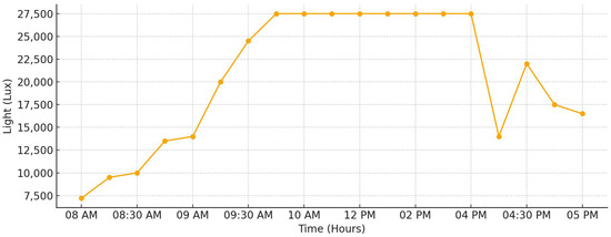 Figure 10 displays the illumination levels measured in lux throughout the day. Starting at 8 a.m., the lux readings are initially around 0.75 × 104 lux, reflecting the low light levels of early morning. As the sun rises, the lux values increase steadily, reaching approximately 2.75 × 104 lux by mid-morning, where they plateau and remain constant through most of the day until around 3:30 p.m. After this period, a gradual decline is observed, with lux readings falling to approximately 1.75 × 104 lux by 5 p.m. as daylight wanes. Furthermore, Figure 11 documents the temperature variations throughout the monitoring period. The recorded temperatures fluctuate between 24 °C in the early morning and peak values around 32 °C during the hottest part of the afternoon, reflecting natural ambient temperature changes driven by solar heating throughout the day. Finally, Figure 12 includes an image of the system’s display screen, which visually presents all real-time data measurements in an easily accessible format. This interface allows homeowners to conveniently monitor and assess the ongoing operational status and performance health of their photovoltaic (PV) system throughout the day, ensuring effective oversight and early detection of any irregularities.