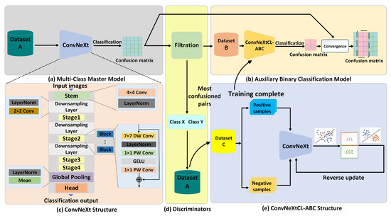 ECL-ConvNeXt is an ensemble strategy combining CL with ConvNeXt. The overall architecture, as shown in Figure 1, consists of a primary multi-class model, a discriminator, and an ABC model. First, the primary model, based on ConvNeXt, performs multi-class prediction. The discriminator quantifies and ranks the confusion matrix generated by the primary model using a validation set to identify the two most confused classes. Next, ConvNeXtCL-ABC is trained to optimize the discriminative ability for these two classes. Finally, during inference, ConvNeXtCL-ABC’s predictions replace the primary model’s original predictions for the corresponding two classes in the confusion matrix, thereby improving the overall MR. The process is detailed in Algorithm 1.