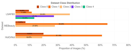 The HotOrNot dataset [23] comprises 2056 facial images collected from the internet, with a low resolution and cluttered backgrounds, pose variations, suboptimal lighting conditions, and unaligned faces, making it a challenging dataset for facial beauty prediction. The images were labeled by multiple raters as “0” (unattractive), “1” (average), or “2” (attractive). The facial beauty label distributions across the three datasets are illustrated in Figure 2.
